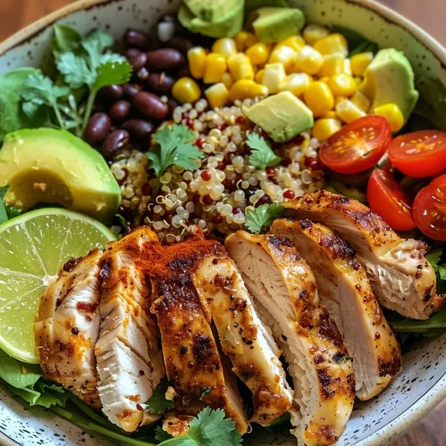 - Assemble bowls with quinoa, greens, black beans, corn, cherry tomatoes, cilantro, and sliced chicken. Add optional toppings and serve.